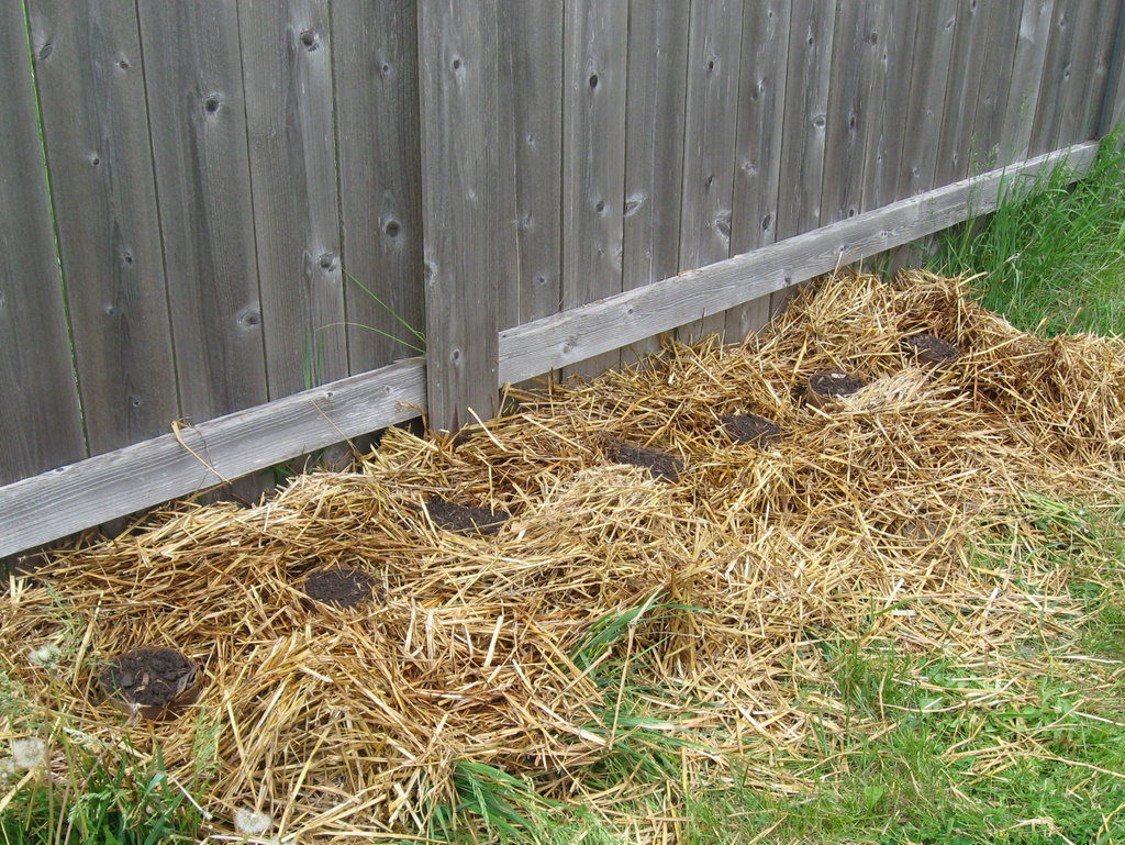 I planted the pole beans along the wooden fence. I used the top half of the 42 oz oatmeal boxes (used the bottom half for pots). I laid down newspaper on top of sod, set the boxes on top, dropped in a double handful of compost, then filled the rest with garden soil. Planted three bean seeds in each, then filled around each one with straw. They’ll probably need water until their roots get down in the soil under the newspaper. I’ll staple some fencing up on the fence to give them something to grab onto.