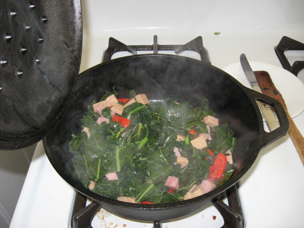 Yesterday, I cooked up a bunch of collards and kale in butter along with some ham and turkey spam and one of our red peppers in a frying pan on the stove. It was awesome. I’m finally figuring out how to cook and enjoy collards.