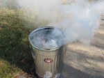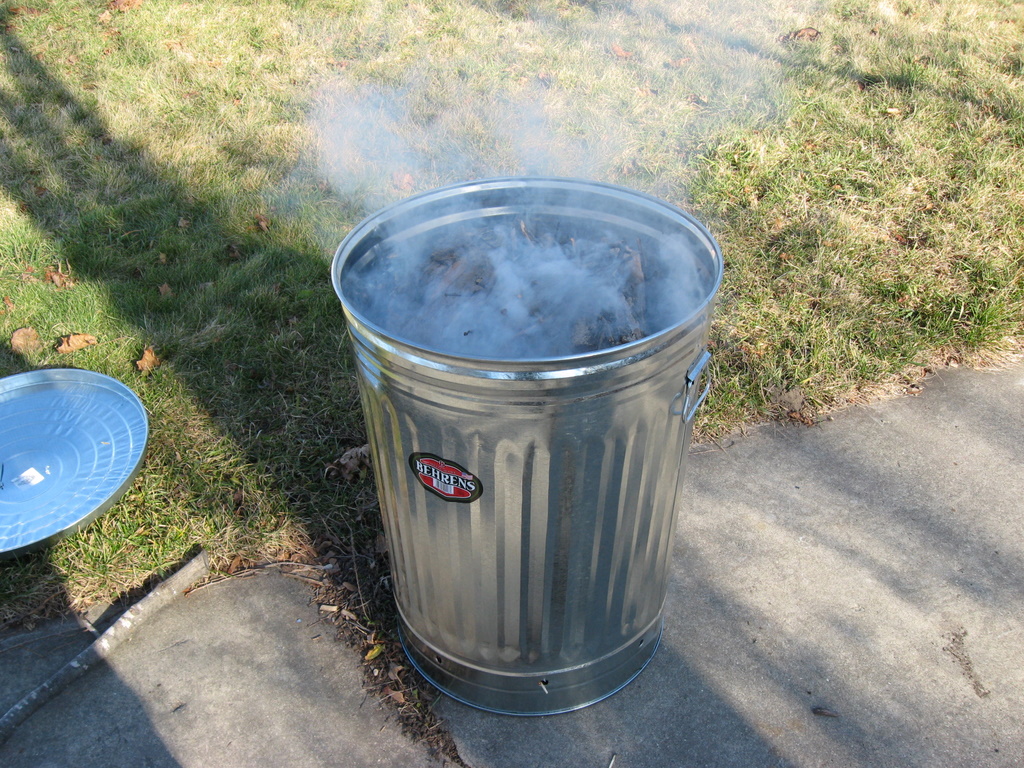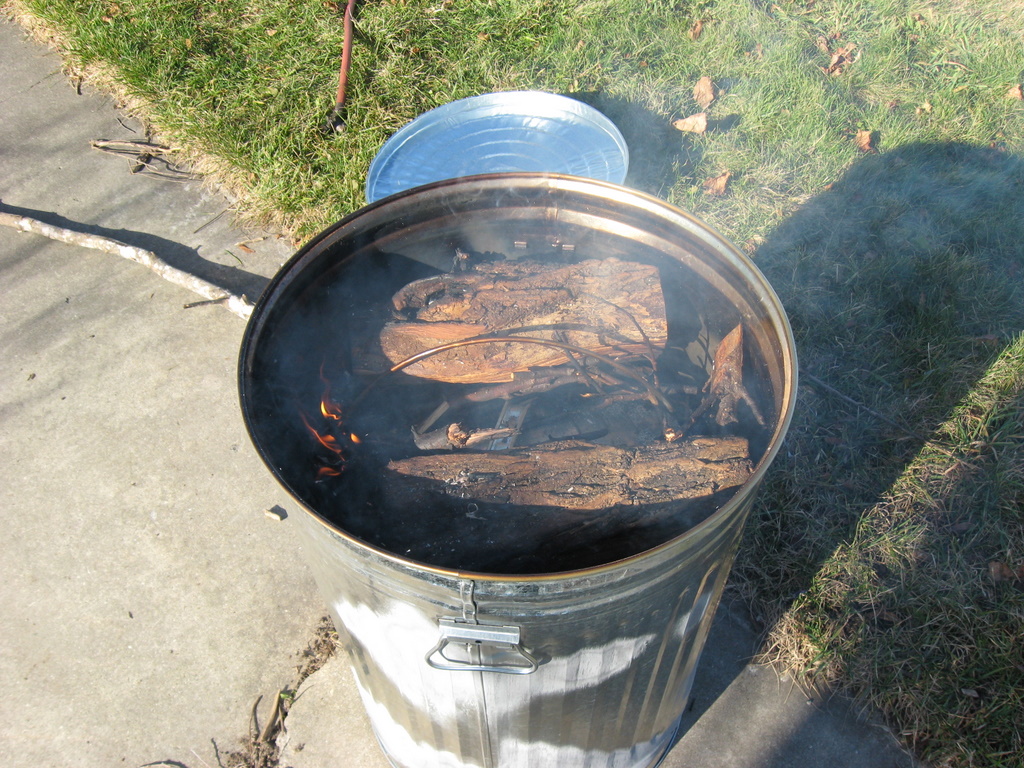 I packed the little one with small-diameter wood, mostly elm, put the top on it, and lit the paper through the holes in the bottom of the large can around 11am. I didn’t make any holes in the smaller can, trusting that gases would escape around the lid without building up enough pressure to cause an explosion.